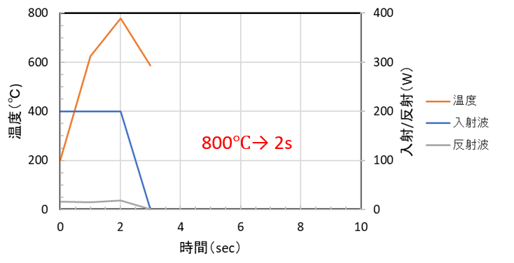 試作したTE111円筒キャビティと周波数追随型の半導体装置を用いることにより、SiC繊維を室温から800℃まで約2秒の超急速加熱を実現できた。